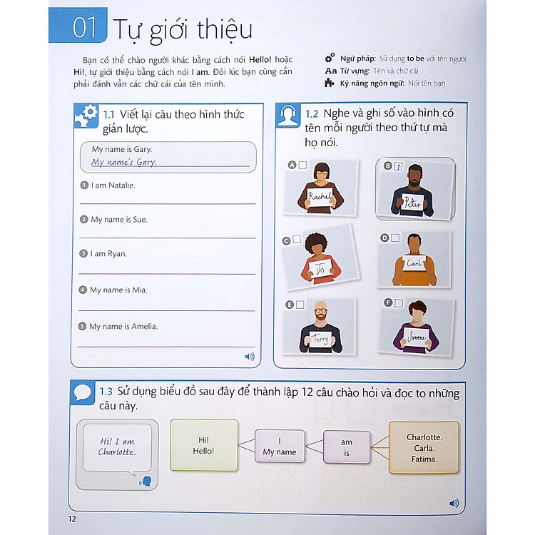 - Các bài tập giúp thực hành viết, đọc, nói và nghe một cách đơn giản.