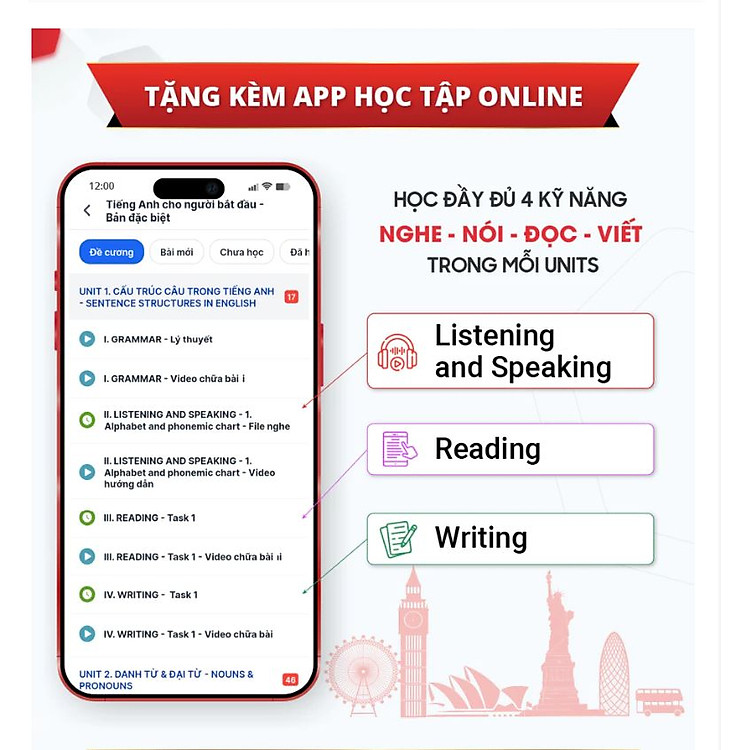 - Bao gồm 30 units với các phần Nghe, Nói, Đọc, Viết và Ngữ Pháp.