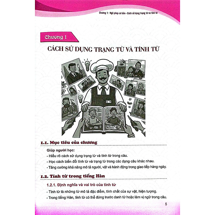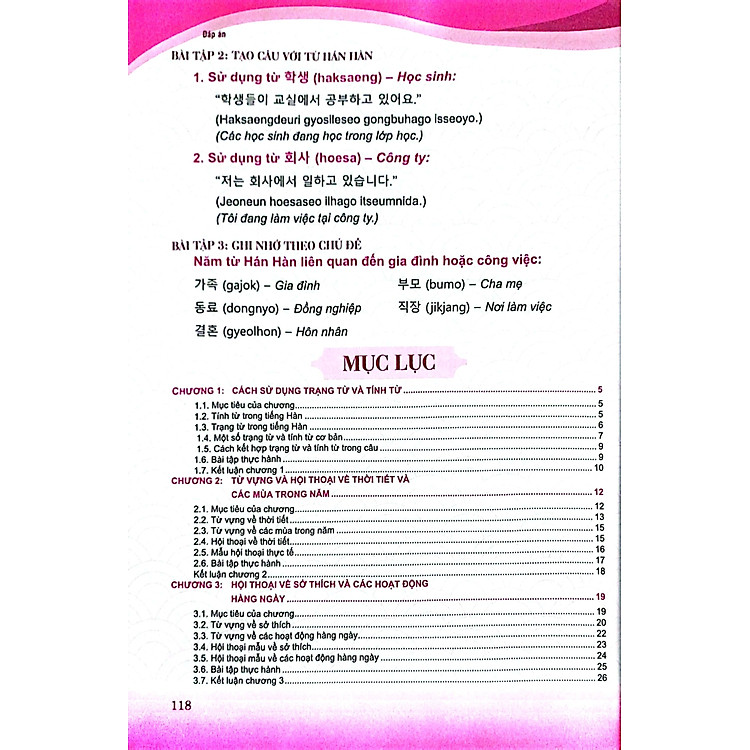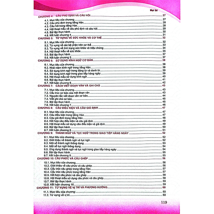 Nội dung sách bao gồm các bài học về ngữ pháp, từ vựng và các mẫu hội thoại thực tế. Từng chương được xây dựng để bạn dần nắm vững các chủ điểm quan trọng như cách sử dụng câu phức, câu điều kiện, kính ngữ, và cách biểu đạt cảm xúc, suy nghĩ trong nhiều bối cảnh khác nhau. Bên cạnh đó, bạn sẽ được tiếp cận với các chủ đề phong phú về văn hóa Hàn Quốc, từ phong tục tập quán, lối sống, cho đến các giá trị truyền thống và hiện đại. Những kiến thức này không chỉ giúp bạn hiểu sâu hơn về ngôn ngữ mà còn kết nối với văn hóa và con người Hàn Quốc một cách chân thực hơn.