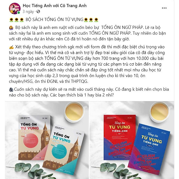 Xét thấy theo chương trình sách giáo khoa mới với form đề thi mới đặc biệt chú trọng vào từ vựng- đọc hiểu. Vì thế mà cô Trang Anh và nhóm tác giả đã dày công biên soạn bộ sách TỔNG ÔN TỪ VỰNG dày hơn 700 trang với hơn 10.000 câu bài tập áp dụng với đa dạng các dạng bài từ vựng từ các phạm trù cơ bản đến nâng cao. Vì thế mà cuốn sách này chắc chắn sẽ đáp ứng tốt nhất mọi nhu cầu học từ vựng của học sinh cấp 2, cấp 3 trong quá trình ôn luyện cho kì thi vào 10, ôn chuyên/Học sinh giỏi , ôn thi đánh gá năng lực ( ĐGNL ) và thi tốt nghiệp trung học phổ thông.