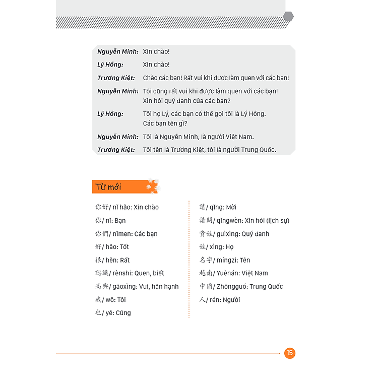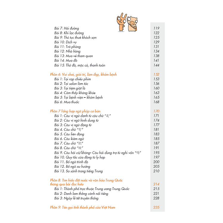 - Mỗi bài học có ba phần chính: hội thoại, từ mới và mẫu câu thường gặp.