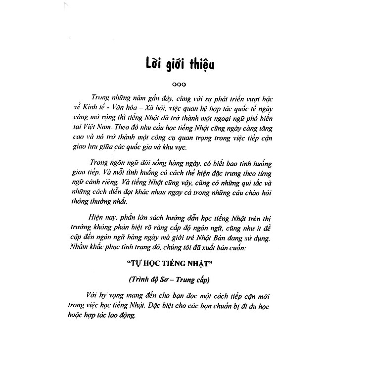 Hiện nay, phần lớn sách hướng dẫn học tiếng Nhật trên thị trường không phân biệt rõ ràng cấp độ ngôn ngữ, cũng như ít đề cập đến ngôn ngữ hàng ngày mà giới trẻ Nhật Bản đang sử dụng. nhằm khắc phục tình trạng đó, hai tác giả Hà Nguyên – Tuyết Nhung biên soạn cuốn sách Tự Học Tiếng Nhật đem đến cho bạn đọc một cách tiếp cận mới trong việc học tiếng Nhật. Đặc biệt cho các bạn chuẩn bị đi du học hoặc hợp tác lao động.
