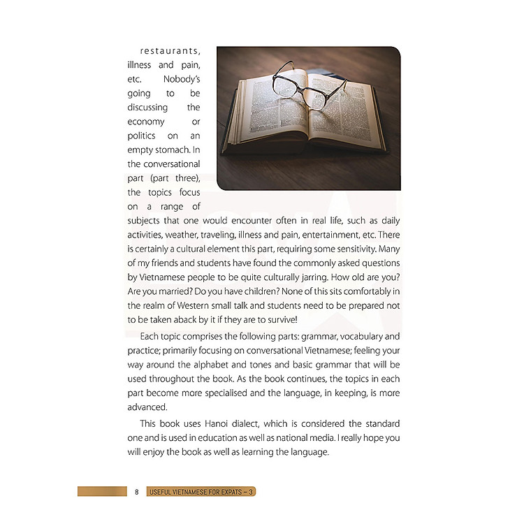 Ngay cả khi bạn đã nắm chắc toàn bộ những kiến thức ngữ pháp tiếng Việt, nhưng bạn còn băn khoăn rằng làm cách nào để có thể giao tiếp một cách trôi chảy nhất có thể vì có biết bao tình huống bạn phải đối mặt hàng ngày. Nếu bạn đã hoàn thành xong hai cấp độ trước của bộ sách này thì cuốn sách Useful Vietnamese for Expats 3 sẽ giúp bạn tiếp cận một cách gần nhất những vấn đề để dễ dàng gợi mở cuộc trò chuyện.