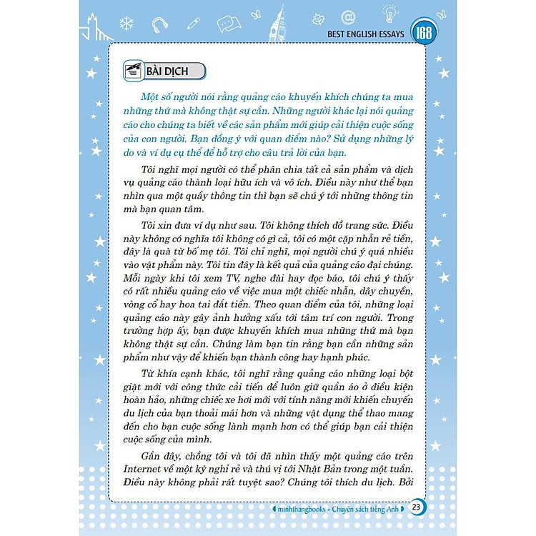 Chắc hẳn rằng việc viết luận tiếng Anh là một trong những kỹ năng quan trọng mà nhiều học viên cần rèn luyện để đạt được kết quả cao trong học tập và thi cử. Quyển sách “168 Bài Luận Tiếng Anh Hay Nhất” của tác giả Minh Thắng, được phát hành bởi Bamboo Books, sẽ là một người bạn đồng hành tuyệt vời giúp bạn nâng cao khả năng viết luận của mình.