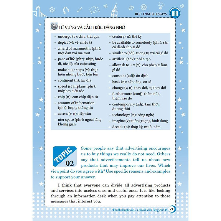 Sách không chỉ đơn thuần là một tập hợp các bài luận mẫu, mà còn cung cấp cho bạn những hướng dẫn chi tiết về cách viết một bài luận sao cho hay và đạt điểm số cao nhất. Với 168 chủ đề bài luận đa dạng, độc giả sẽ được khám phá nhiều khía cạnh khác nhau của cuộc sống, từ các vấn đề xã hội, môi trường đến các vấn đề văn hóa và giáo dục. Điều này không chỉ giúp học viên có thêm nhiều ý tưởng viết mà còn mở rộng cái nhìn đa chiều về các vấn đề mà thế giới đang đối mặt.