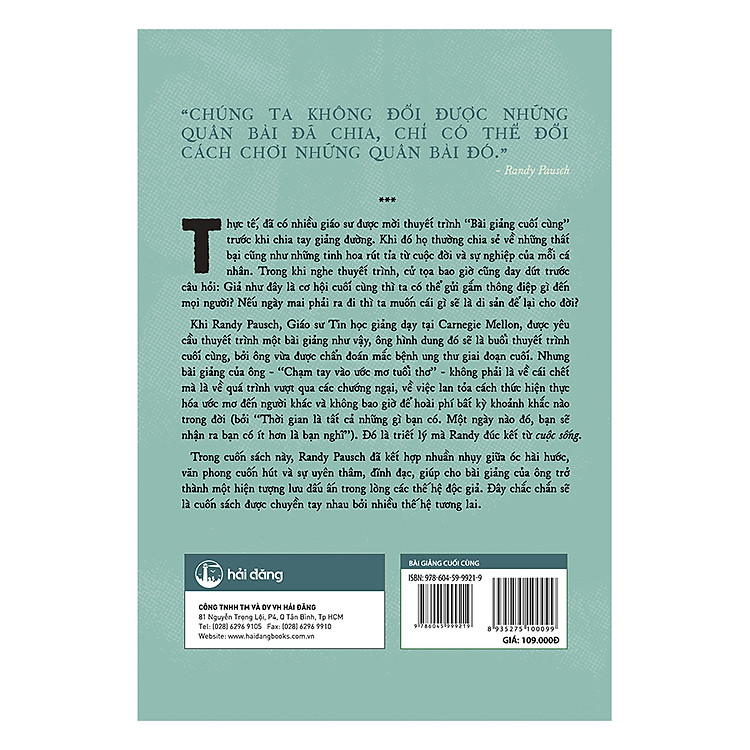 Bài Giảng Cuối Cùng là một tác phẩm đầy cảm hứng và ý nghĩa, được viết bởi giáo sư Randy Pausch. Trong cuốn sách này, ông đã chia sẻ những bài học quý giá từ cuộc sống và sự nghiệp của mình, với thông điệp rằng chúng ta không thể thay đổi những quân bài đã được chia, nhưng chúng ta có thể thay đổi cách chơi những quân bài đó. Đây là một cuốn sách không chỉ dành cho những người đang tìm kiếm động lực, mà còn cho bất kỳ ai muốn sống một cuộc đời đầy ý nghĩa.