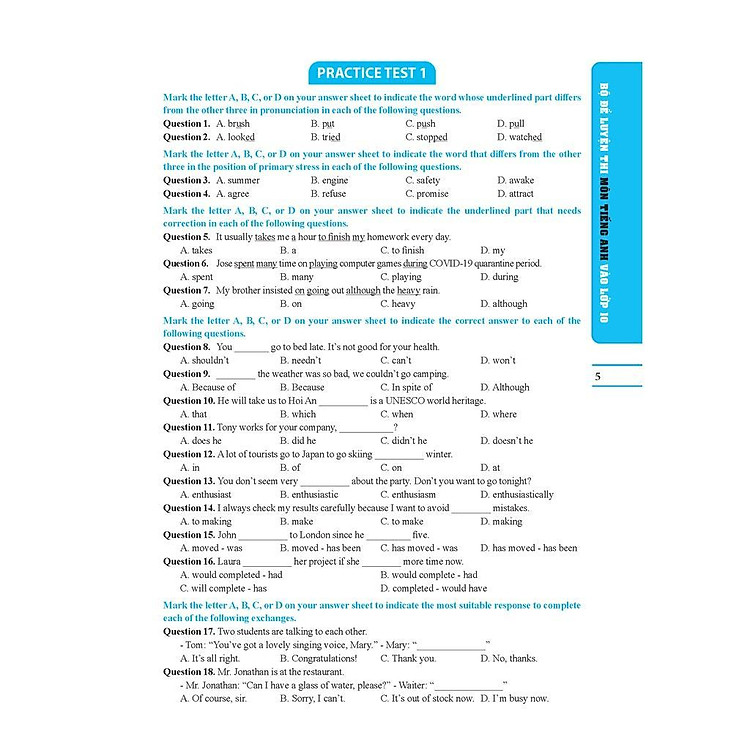 Bộ đề luyện thi bao gồm nhiều dạng bài tập khác nhau, từ bài kiểm tra trắc nghiệm đến bài viết tự luận, giúp học sinh làm quen với cấu trúc đề thi. Qua đó, các em có thể nắm vững kiến thức ngữ pháp, từ vựng, cũng như phát triển khả năng nghe, nói, đọc, viết tiếng Anh. Sách được biên soạn bởi những giáo viên dày dạn kinh nghiệm, đảm bảo phù hợp với chương trình học cũng như yêu cầu của kỳ thi.