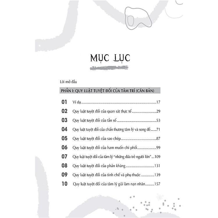 Trong phần lý thuyết, từ chương 1, tác giả sẽ dẫn dắt bạn qua từng quy luật với những ví dụ cụ thể và minh họa sinh động. Những quy luật này không chỉ giúp bạn hiểu rõ hơn về cách mà tâm trí hoạt động mà còn có thể giúp bạn thay đổi cách nhìn nhận và xử lý các tình huống trong cuộc sống. Mỗi chương đều được viết một cách dễ hiểu và gần gũi, mang đến cho bạn những bài học giá trị.