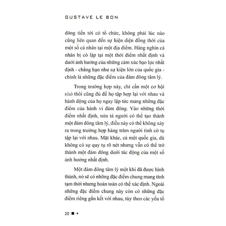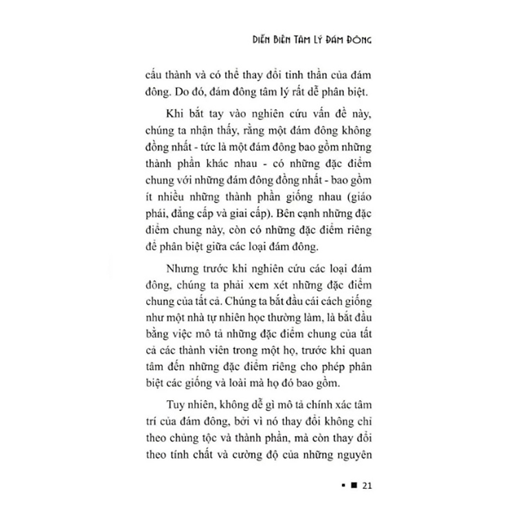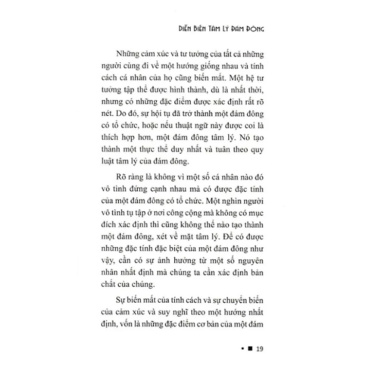 Cuốn sách “Diến Biến Tâm Lý Đám Đông” của tác giả Gustave Le Bon là một tác phẩm kinh điển trong lĩnh vực tâm lý học xã hội. Tác giả đã phân tích sâu sắc cơ chế hoạt động của đám đông và những ảnh hưởng của nó đến hành vi và tư duy của cá nhân. Qua đó, Le Bon đã chỉ ra rằng trong một đám đông, con người thường sẽ hành động theo cách mà không thể hiện khi họ ở trạng thái bình thường.