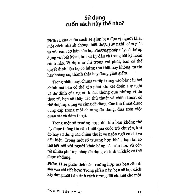 Trong cuộc sống hàng ngày, việc giao tiếp và hiểu biết tâm lý con người là rất quan trọng. Từ những buổi gặp gỡ bạn bè, đến những cuộc đàm phán công việc, khả năng đọc vị người khác sẽ giúp bạn đưa ra những quyết định chính xác và hiệu quả hơn. “Đọc Vị Bất Kỳ Ai” cung cấp cho bạn các kỹ thuật phân tích ngôn ngữ cơ thể, biểu cảm khuôn mặt và giọng nói, giúp bạn có cái nhìn sâu sắc hơn về những gì người khác đang nghĩ và cảm nhận.