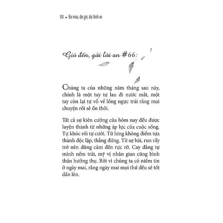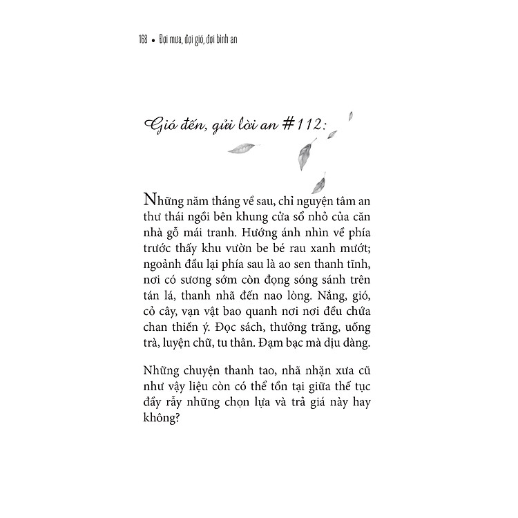 Sách được thiết kế đẹp mắt với chất lượng in ấn cao, phù hợp với những ai yêu thích đọc sách và sưu tầm. Với giá bìa chỉ 119.000 VNĐ, đây là một món quà ý nghĩa cho bản thân hoặc cho những người thân yêu. “Đợi Mưa, Đợi Gió, Đợi Bình An” không chỉ là một cuốn sách, mà còn là một lời nhắc nhở về sự bình an trong tâm hồn, giúp độc giả tìm lại những giây phút thư giãn giữa bộn bề lo toan của cuộc sống.