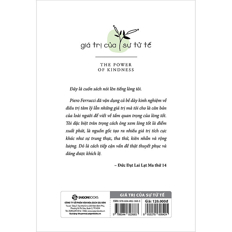 Mua Giá Trị Của Sự Tử Tế (Tái Bản) là một tác phẩm đầy ý nghĩa, mang đến cho người đọc những cái nhìn sâu sắc về lòng tốt và sự đồng cảm. Đây không chỉ là một cuốn sách, mà còn là một hành trình khám phá những giá trị cốt lõi giúp chúng ta sống có ý nghĩa hơn. Với mỗi trang sách, độc giả sẽ nhận ra rằng, lòng tốt và sự đồng cảm không chỉ là những phẩm chất cần thiết trong cuộc sống mà còn là nguồn gốc của hạnh phúc và niềm vui vĩnh cửu.