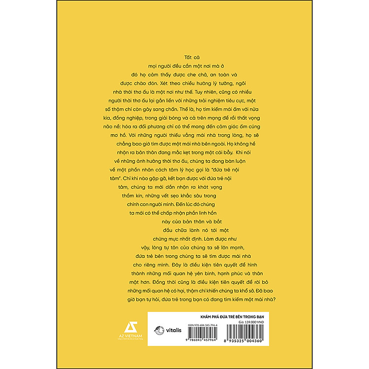 Khi nhắc đến “ngôi nhà thời thơ ấu”, hẳn bạn sẽ nghĩ ngay đến những kỷ niệm đẹp, ngọt ngào và bình yên. Đứa trẻ bên trong bạn là nơi chứa đựng những kỷ niệm về một mái ấm tràn đầy tình yêu thương và sự che chở. Tác phẩm này không chỉ giúp bạn hồi tưởng lại những giấc mơ và khát vọng của tuổi thơ mà còn khuyến khích bạn chấp nhận và yêu thương bản thân hơn.