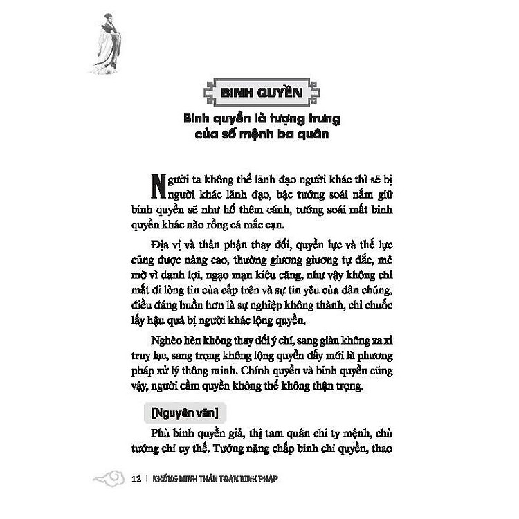 Khổng Minh – Thần Toán Binh Pháp là một tác phẩm không thể thiếu cho những ai đam mê tìm hiểu về chiến lược và mưu lược trong quân sự. Cuốn sách bao gồm 3 chương lớn, mỗi chương mang đến những kiến thức quý giá từ nhà quân sư tài ba Gia Cát Lượng, hay còn gọi là Khổng Minh. Với sự kết hợp giữa lý thuyết và thực tiễn, cuốn sách này sẽ giúp bạn nắm vững các kỹ năng cần thiết để áp dụng trong cuộc sống cũng như trong các quyết định quan trọng.