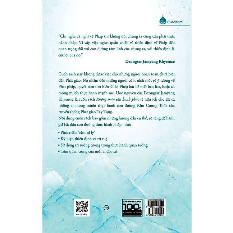 SÁCH – KHÔNG MƯU CẦU HẠNH PHÚC: MỘT HƯỚNG DẪN CHO THỰC HÀNH PHÁP SƠ KHỞI là một tác phẩm đặc biệt của tác giả Dzongsar Jamyang Khyentse, được xuất bản bởi Công ty CP Sách Thái Hà. Cuốn sách này không chỉ là một hướng dẫn mà còn là một nguồn cảm hứng cho những ai đang tìm kiếm sự bình an và hạnh phúc thực sự trong cuộc sống.