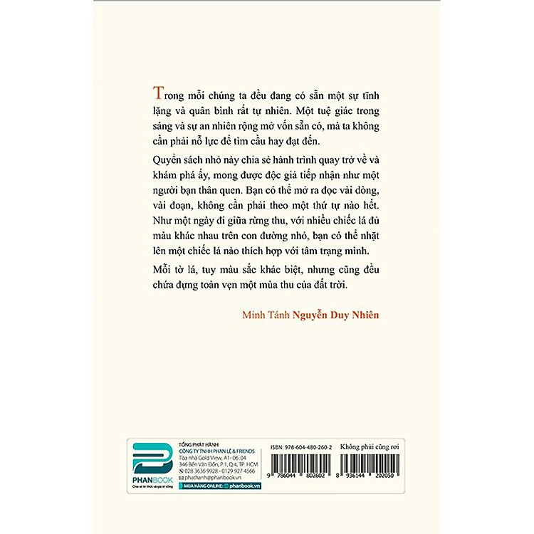 Cuốn sách không chỉ là những trang giấy đơn thuần, mà là một hành trình khám phá bản thân. Khi đọc “Không Phủi Cũng Rơi”, bạn sẽ tìm thấy những giây phút bình yên giữa cuộc sống bộn bề, cùng với những suy ngẫm sâu sắc về ý nghĩa của sự sống. Tác phẩm như một người bạn đồng hành, giúp bạn nhận ra rằng hạnh phúc và sự tĩnh lặng không phải ở nơi xa xôi nào, mà chính là ở trong chính chúng ta.