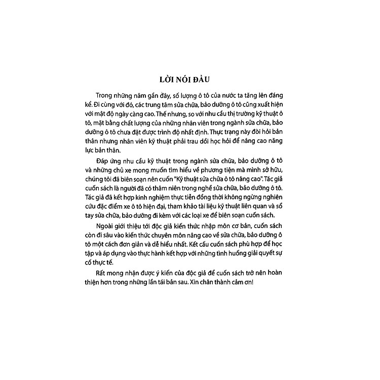 Kỹ Thuật Sửa Chữa Ô Tô Nâng Cao (Tái Bản) là một cuốn sách cực kỳ hữu ích dành cho những ai đang làm việc trong lĩnh vực sửa chữa ô tô hoặc muốn nâng cao tay nghề của mình. Với sự phát triển không ngừng của công nghệ ô tô, việc cập nhật kiến thức và kỹ năng là điều cần thiết. Cuốn sách này không chỉ cung cấp những kiến thức cơ bản mà còn đi sâu vào các kỹ thuật sửa chữa hiện đại, giúp người đọc có cái nhìn tổng quan và chi tiết về ngành công nghiệp ô tô.