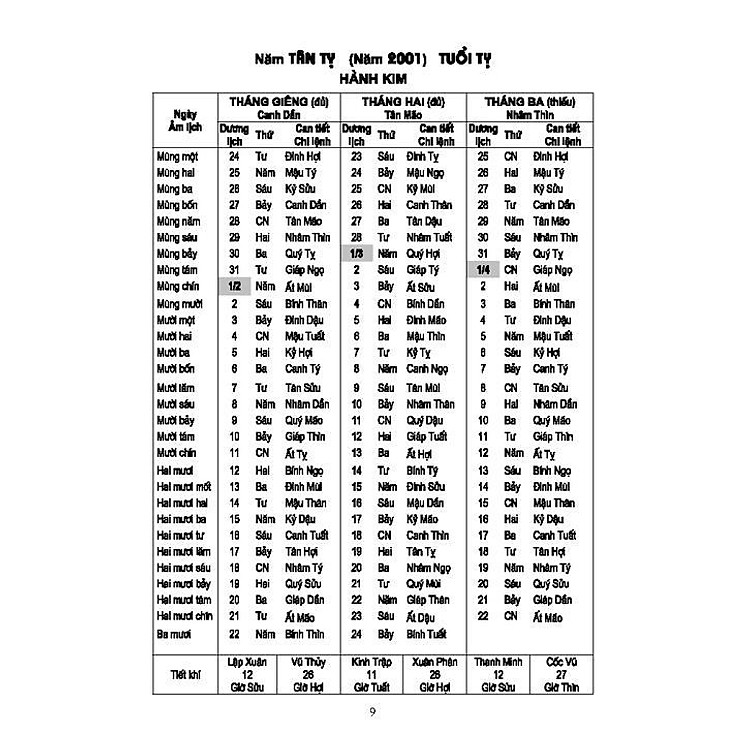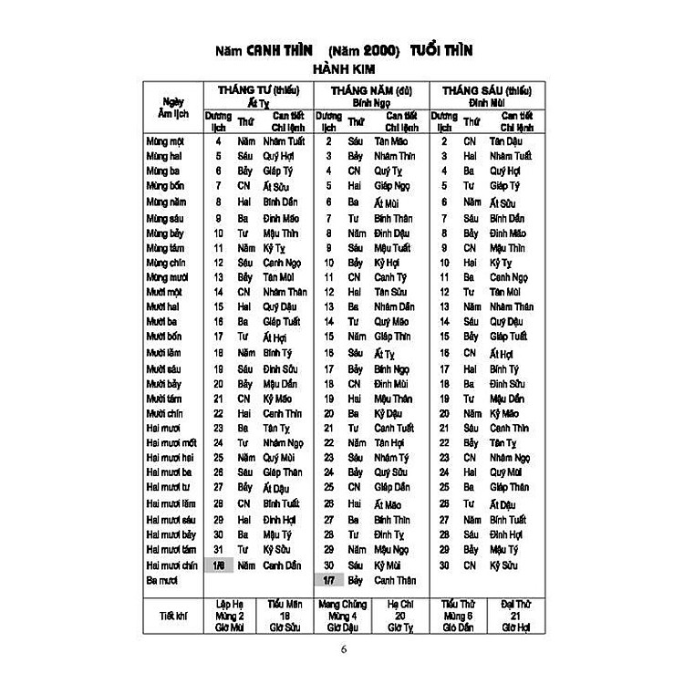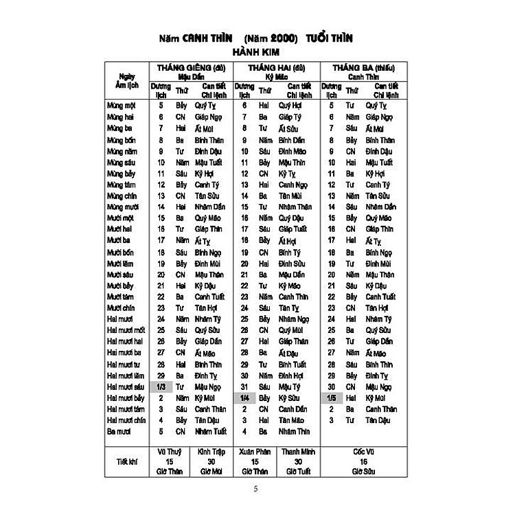 Trong phần đầu tiên, cuốn sách trình bày biểu lịch âm dương từ năm 2000 đến năm 2120. Đây là một tài liệu hữu ích giúp người đọc nắm bắt được sự chuyển giao của thời gian theo từng năm, tháng và ngày âm lịch. Các thông tin được hệ thống hóa rõ ràng, dễ hiểu, giúp cho việc tra cứu trở nên thuận tiện hơn bao giờ hết. Điều này không chỉ có ý nghĩa trong việc lập kế hoạch cho các dịp lễ tết và sự kiện quan trọng trong năm mà còn giúp người đọc hiểu rõ hơn về những đặc điểm riêng biệt của từng năm theo lịch âm.