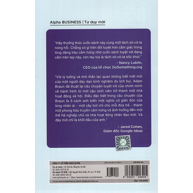 Lời Hứa Về Một Cây Bút Chì không chỉ là một cuốn sách mà còn là một hành trình đầy cảm hứng từ Adam Braun – một người sáng lập phi lợi nhuận có tầm nhìn xa trông rộng. Cuốn sách kể về hành trình từ 25 đô-la đến việc xây dựng 250 trường học dành cho trẻ em trên toàn cầu. Đó là một câu chuyện về lòng kiên trì, niềm tin và khát vọng thay đổi thế giới thông qua giáo dục.