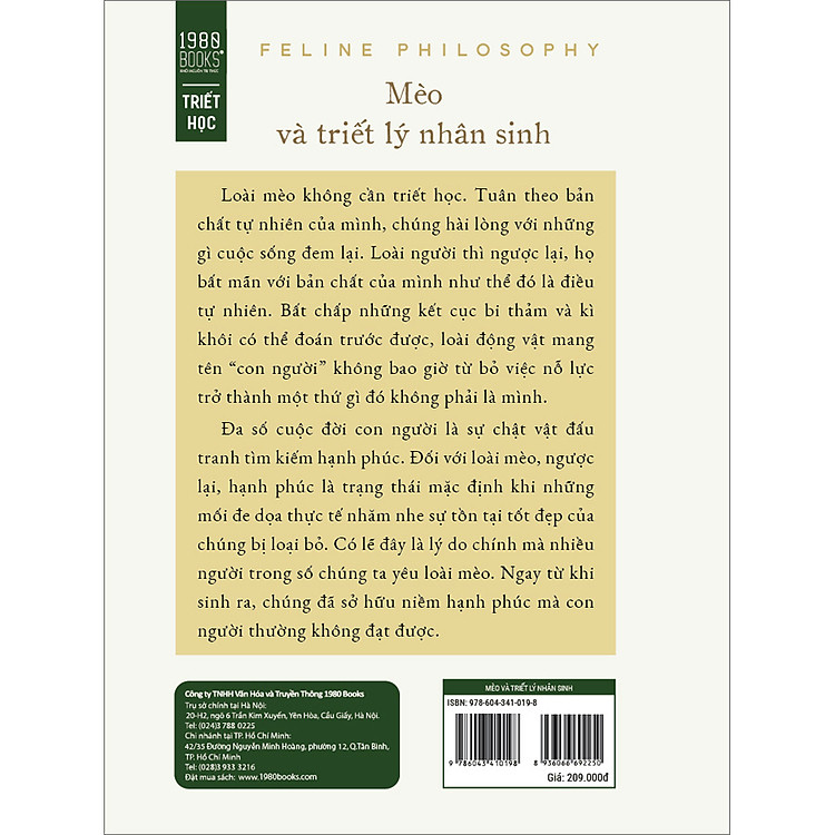 Không chỉ cung cấp kiến thức, “Mèo Và Triết Lý Nhân Sinh – Mèo Đã Dạy Chúng Ta Điều Gì Về Cuộc Sống” còn truyền cảm hứng mạnh mẽ cho độc giả. Đây là lựa chọn tuyệt vời cho những ai muốn tìm nguồn động lực mới. Hãy tham khảo ngay bảng giá bên dưới để mua sách dễ dàng và tiết kiệm hơn.”