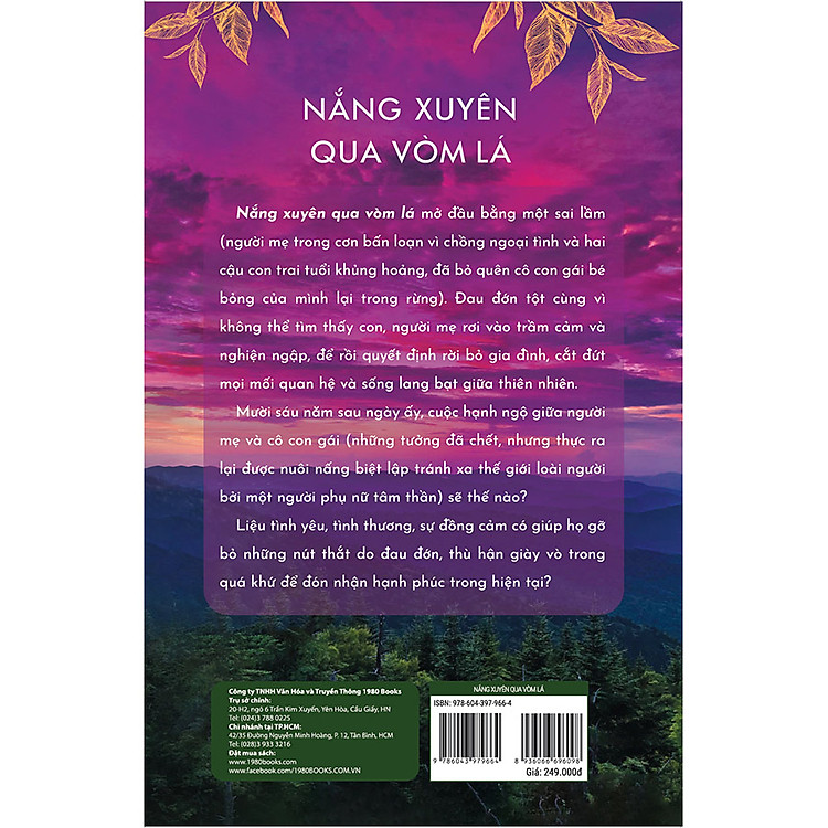 “Mua Nắng Xuyên Qua Vòm Lá” kể về những nhân vật đối mặt với những bóng tối trong quá khứ, tìm kiếm ánh sáng và hy vọng trong cuộc sống. Tác phẩm không chỉ mang đến những câu chuyện riêng lẻ mà còn phản ánh những mối quan hệ phức tạp giữa con người với nhau và với thiên nhiên. Qua từng trang sách, bạn sẽ cảm nhận được sức mạnh của tình yêu, sự hy sinh và lòng can đảm trong việc vượt qua khó khăn.