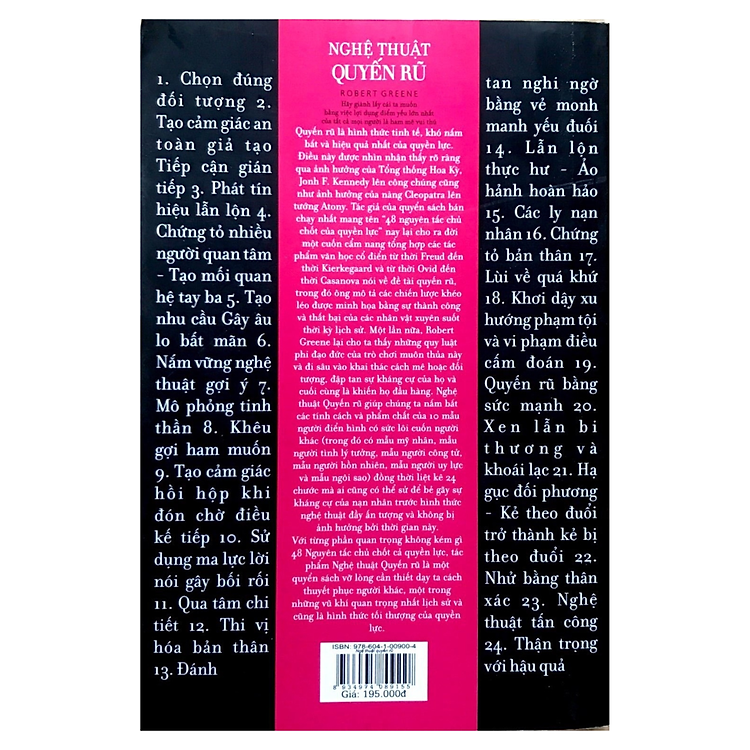Nghệ Thuật Quyến Rũ không chỉ đơn thuần là một cuốn sách, mà còn là một hành trình khám phá bản thân và phát triển kỹ năng giao tiếp xã hội. Trong một thế giới mà sự ảnh hưởng không chỉ đến từ lời nói rõ ràng, mà còn từ cách bạn xuất hiện và “hút” người khác, cuốn sách này sẽ giúp bạn trang bị những công cụ cần thiết để thu hút sự chú ý và lòng tin của người khác.