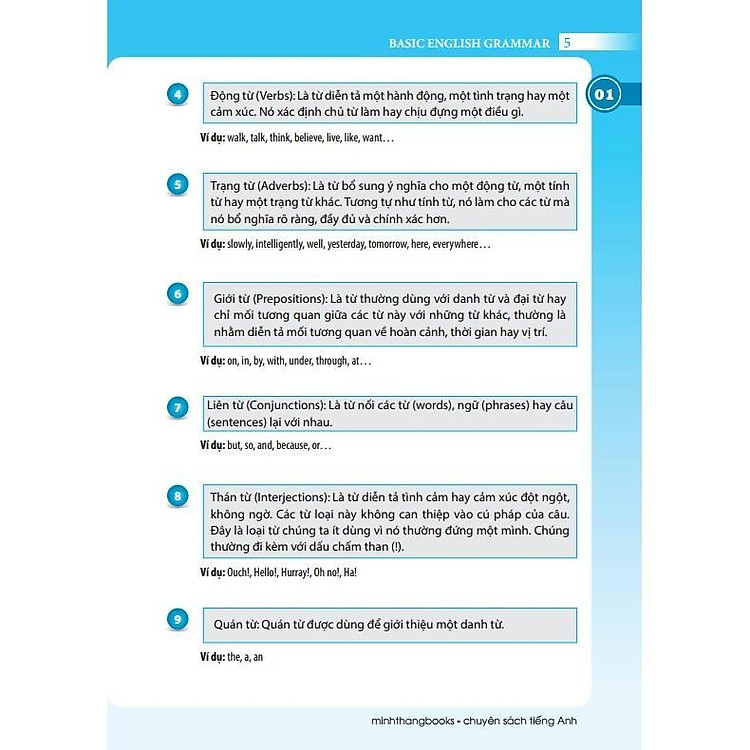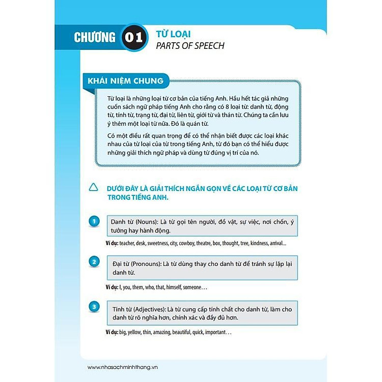 - Nội dung tập trung vào các phần ngữ pháp cơ bản: danh từ, động từ, tính từ, trạng từ, v.v.
