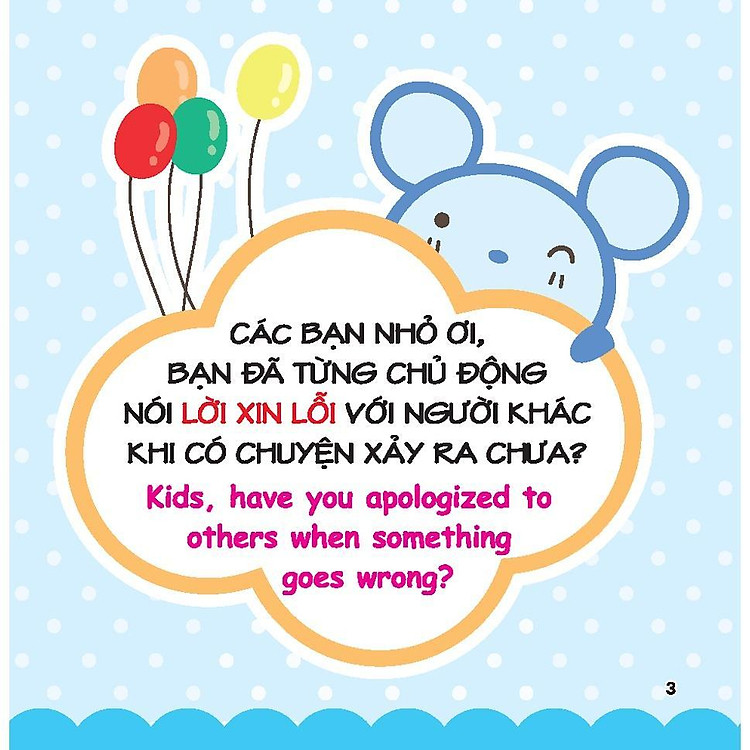 Bộ sách bao gồm 8 cuốn, mỗi cuốn tập trung vào một khía cạnh khác nhau của kỹ năng giao tiếp. Cuốn Lời xin lỗi là một trong những chủ đề quan trọng nhất, giúp trẻ hiểu được giá trị của việc xin lỗi và cách thể hiện lòng chân thành. Sách được viết theo hình thức song ngữ Anh – Việt, không chỉ giúp trẻ làm quen với tiếng Anh từ sớm mà còn củng cố ngôn ngữ mẹ đẻ.