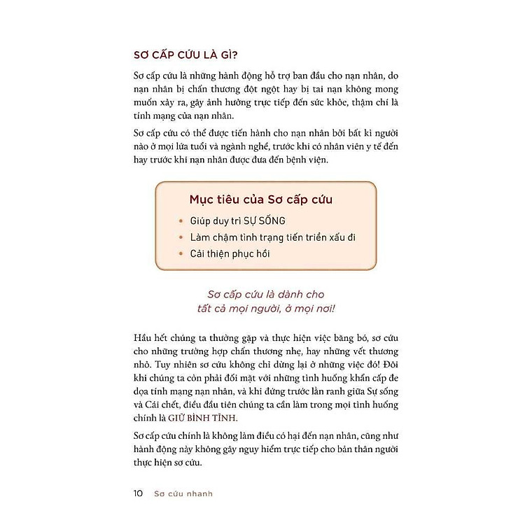 Cuốn cẩm nang này tổng hợp các kiến thức cơ bản về sơ cấp cứu, từ việc xử trí các vết thương, cắt đứt, bỏng cho đến các tình huống nguy hiểm như ngạt thở hay đột quỵ. Mỗi phần đều được minh họa bằng hình ảnh rõ ràng, giúp bạn dễ dàng nắm bắt phương pháp thực hiện. Bên cạnh đó, sách còn cung cấp những mẹo nhỏ, lưu ý quan trọng giúp bạn tự tin hơn khi cần hỗ trợ người khác trong các tình huống khẩn cấp.