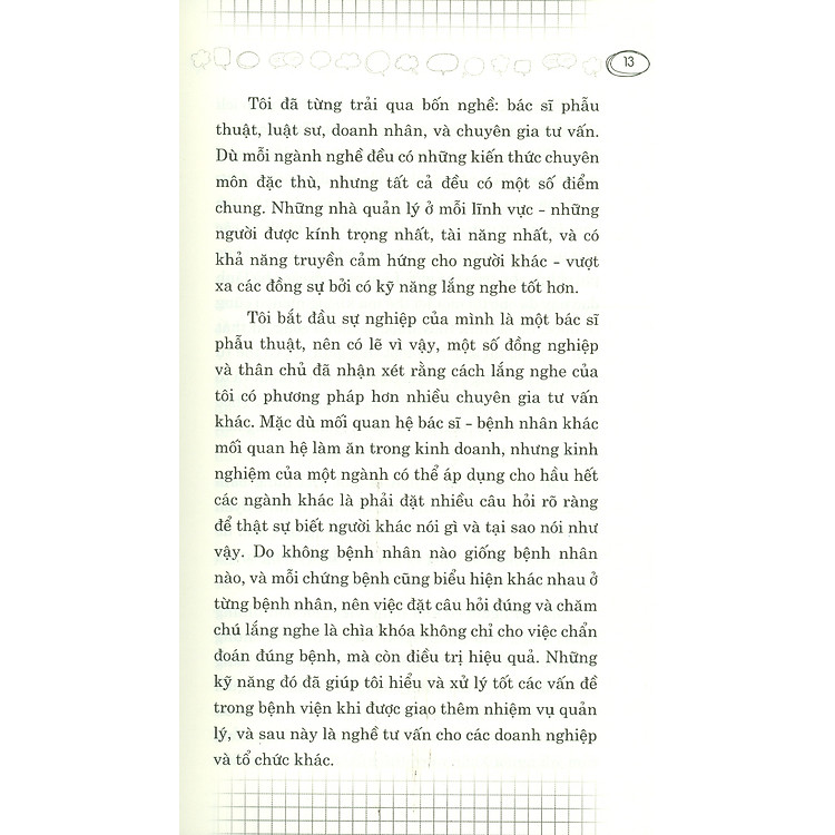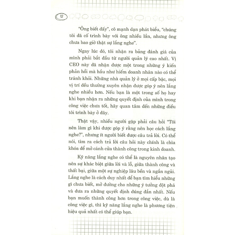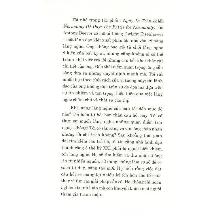 Cuốn sách giúp bạn hiểu rõ hơn về tầm quan trọng của việc lắng nghe trong việc xây dựng mối quan hệ và tạo dựng niềm tin với khách hàng. Qua đó, bạn sẽ học được cách nhận diện các tín hiệu không lời, cách đặt câu hỏi mở và cách phản hồi một cách hiệu quả. Những kỹ thuật này không chỉ giúp bạn trở thành một người lắng nghe tốt hơn mà còn giúp bạn trở thành một nhà lãnh đạo xuất sắc.