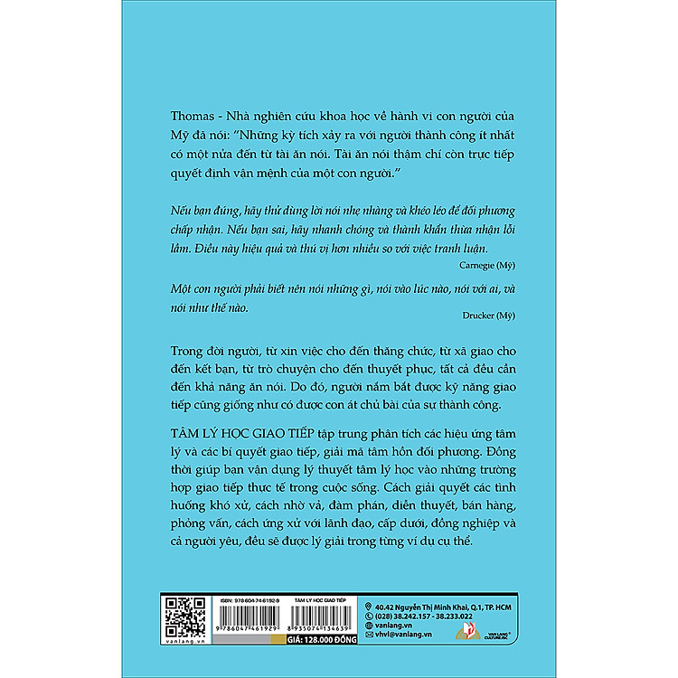 Tâm Lý Học Giao Tiếp là một tác phẩm đáng chú ý về nghệ thuật giao tiếp, giúp bạn nắm bắt và áp dụng những nguyên tắc tâm lý học vào cuộc sống hàng ngày. Với sự dẫn dắt của Thomas, một nhà nghiên cứu hàng đầu trong lĩnh vực hành vi con người, cuốn sách mở ra cho bạn những bí quyết để trở thành một người giao tiếp xuất sắc. Ông đã từng nói: “Những kỳ tích xảy ra với người thành công ít nhất có một nửa đến từ tài ăn nói.” Như vậy, tài ăn nói không chỉ là một kỹ năng mà còn là một công cụ mạnh mẽ quyết định con đường thành công của bạn.