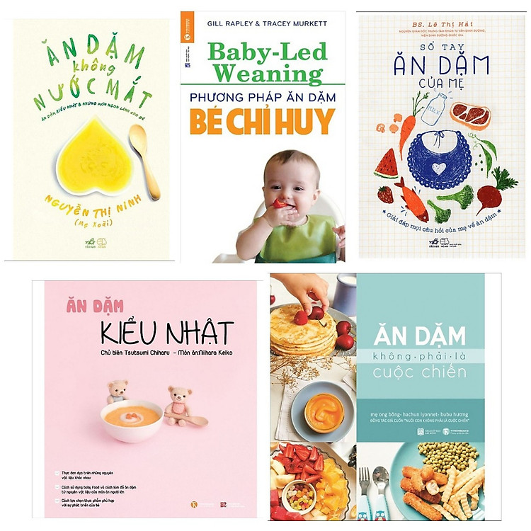 - Combo sách gồm 5 cuốn về ăn dặm cho bé: “Ăn dặm kiểu Nhật”, “Ăn dặm không phải cuộc chiến”, “Phương pháp ăn dặm bé chỉ huy”, “Ăn dặm không nước mắt”, và “Sổ tay ăn dặm của mẹ”.