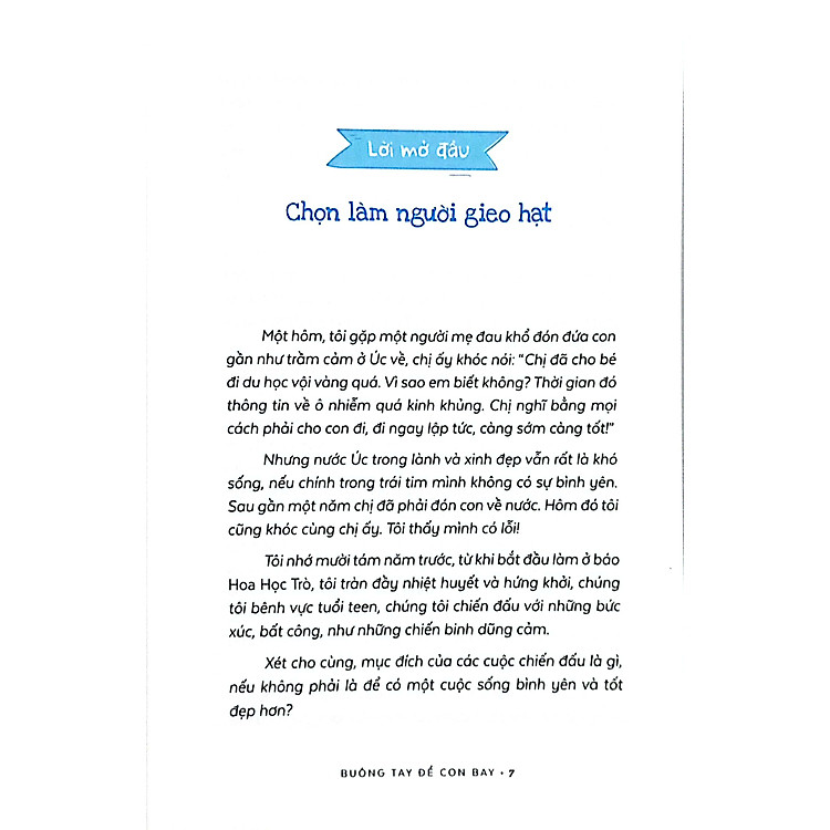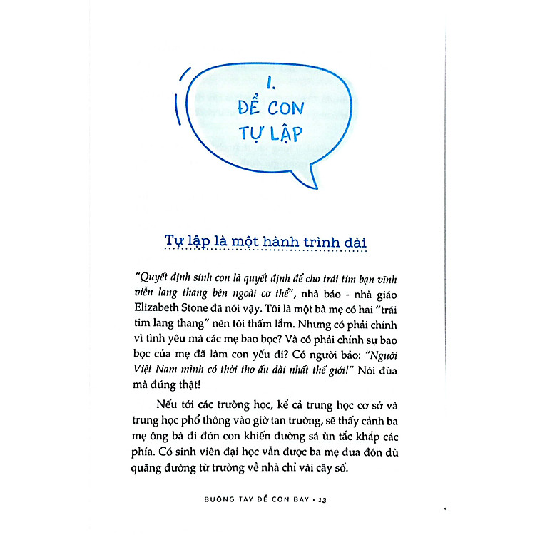Buông Tay Để Con Bay không chỉ đơn thuần là một cuốn sách về giáo dục trẻ em; nó còn là một hành trình khám phá cách mà cha mẹ có thể rèn luyện cho con cái tính tự lập. Tác giả trình bày những phương pháp thực tiễn, giúp trẻ phát triển khả năng tự học, tự phục vụ bản thân và xây dựng sự tự tin. Bằng cách khuyến khích cha mẹ “buông tay” để con có thể tự do khám phá thế giới xung quanh, cuốn sách mong muốn tạo ra những thế hệ trẻ có chính kiến và hạnh phúc thực sự.