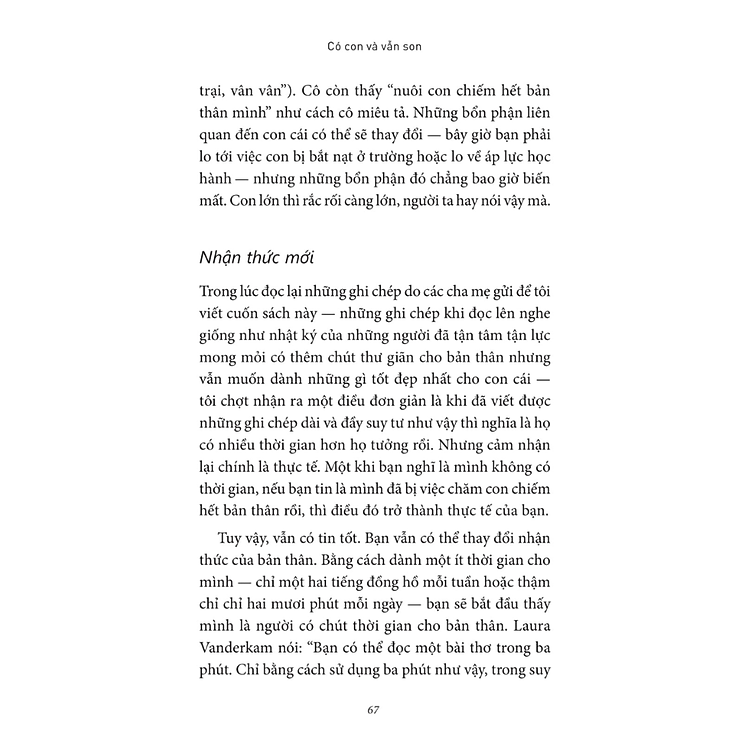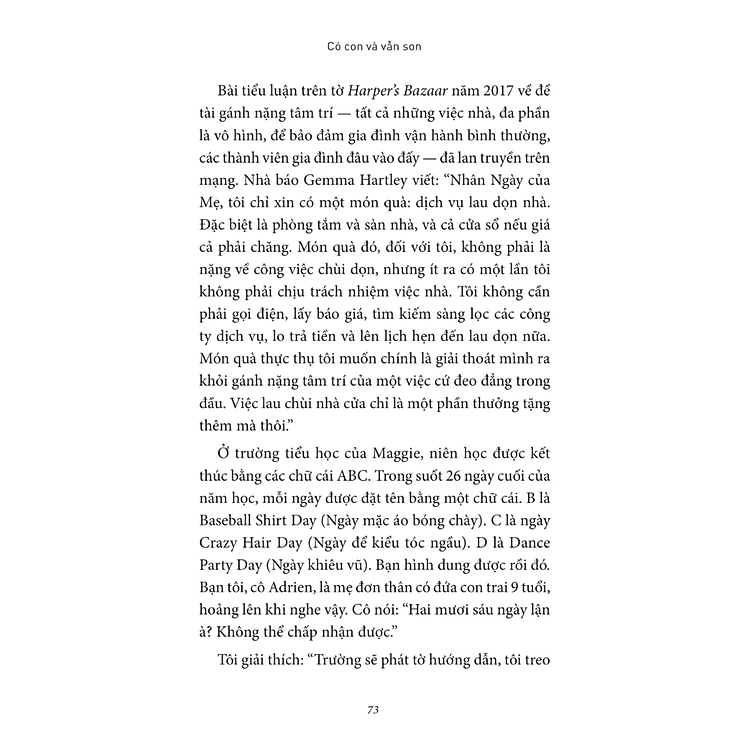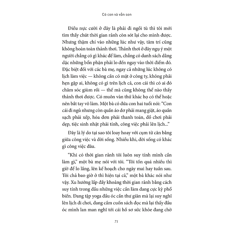 Có Con Và Vẫn Son là một tác phẩm tập trung vào việc khám phá cách mà cha mẹ có thể duy trì cuộc sống riêng tư trong khi nuôi dưỡng con cái. Tác giả Rachel Bertsche đưa ra nhiều câu chuyện thực tiễn, kết hợp với những bài học quý giá từ chính cuộc sống của mình. Cuốn sách nhấn mạnh rằng việc giữ gìn bản sắc cá nhân không chỉ có lợi cho bản thân mà còn cho cả gia đình. Bạn sẽ tìm thấy những chiến lược cụ thể để tạo ra không gian cho riêng mình, từ đó cải thiện chất lượng cuộc sống cho cả bạn và con cái.