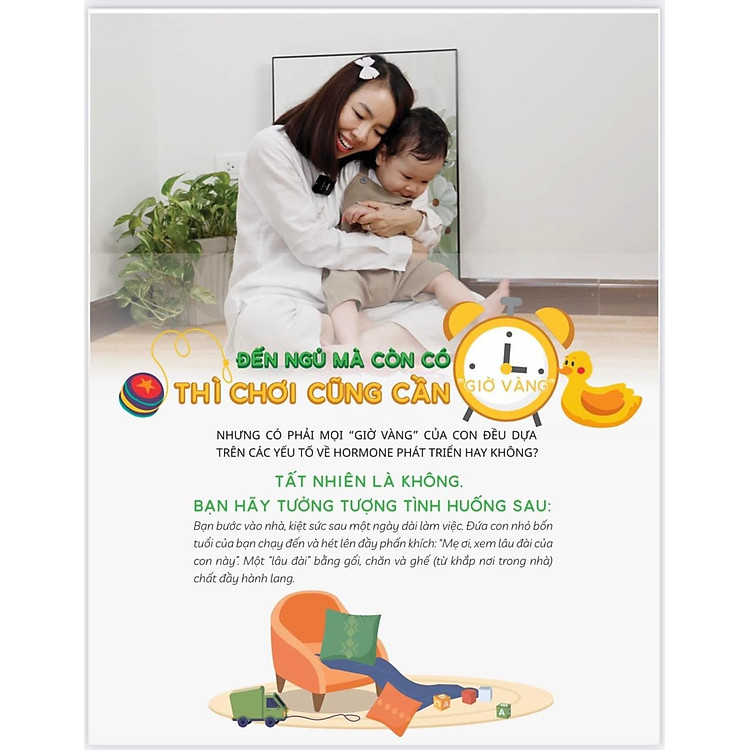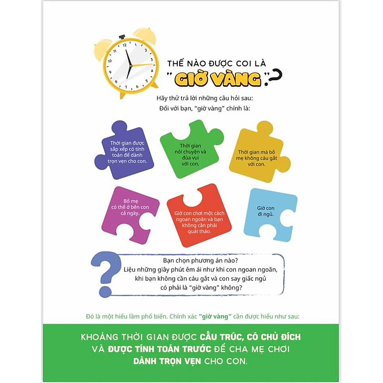 Giờ Vàng Cho Trẻ là một cuốn sách được thiết kế đặc biệt với mục tiêu hỗ trợ các bậc phụ huynh trong việc tạo ra những giờ phút vui vẻ và bổ ích cho trẻ. Cuốn sách cung cấp hướng dẫn cho các hoạt động sáng tạo, từ đó giúp cha mẹ có thể thiết kế những giờ vàng cho trẻ một cách dễ dàng. Đặc biệt, cuốn sách còn đi kèm với những thẻ trò chơi phong phú, như “Ai nhanh mắt hơn?” và “Kể chuyện sáng tạo”, nhằm kích thích sự hứng thú và trí tưởng tượng của trẻ.