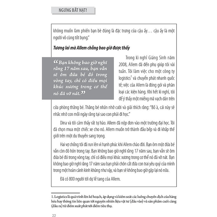 Bạn có từng cảm thấy áp lực khi chứng kiến những hành động bắt nạt quanh mình? Có lẽ, trong chuyến hành trình trưởng thành, ai trong chúng ta cũng đã một lần trải qua cảm giác đó. Cuốn sách “Ngưng Bắt Nạt – Cuốn Sách Thúc Đẩy Chúng Ta Cùng Nhau Hành Động” không chỉ đơn thuần là một cuốn sách về bắt nạt; mà còn là một lời kêu gọi mạnh mẽ về lòng can đảm và sự đồng cảm. Cuốn sách này sẽ giúp bạn nhận ra rằng, hành động của mỗi người có thể tạo nên sự khác biệt lớn lao trong cuộc sống của người khác.