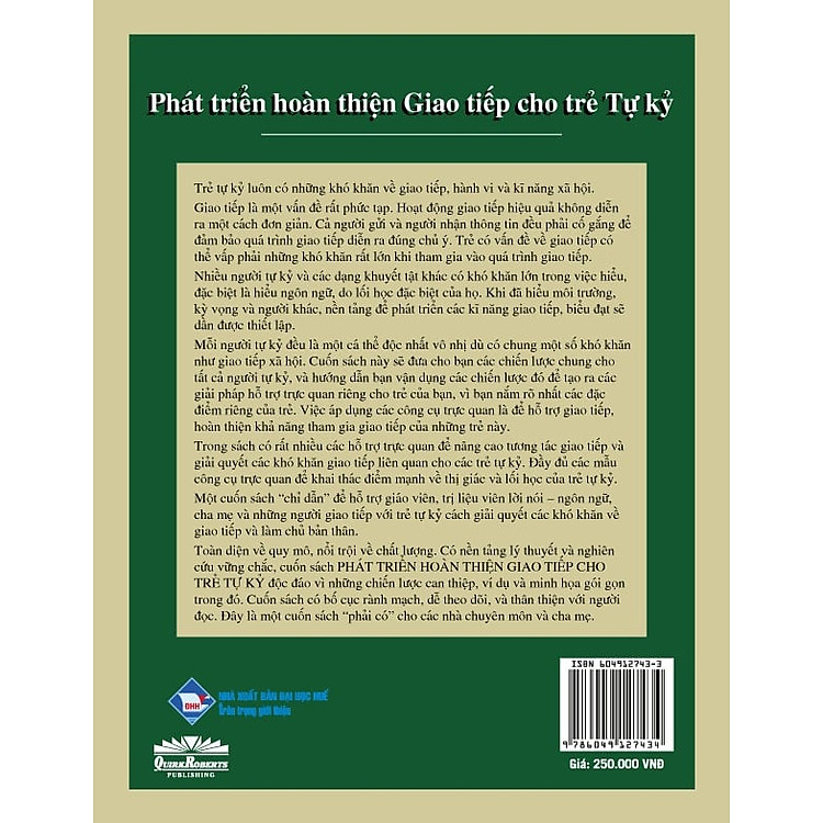 Phát triển Hoàn thiện Giao tiếp cho Trẻ Tự Kỷ là một tác phẩm được xây dựng dựa trên nền tảng nghiên cứu và kinh nghiệm thực tiễn trong việc hỗ trợ trẻ em tự kỷ. Cuốn sách cung cấp những kiến thức cần thiết về đặc điểm tâm lý, hành vi của trẻ tự kỷ, đồng thời đưa ra các phương pháp giao tiếp đơn giản và hiệu quả. Những ý tưởng trong cuốn sách không chỉ giúp cha mẹ, giáo viên, mà còn cả những người làm công tác hỗ trợ trẻ tự kỷ hiểu rõ hơn về cách thức giúp trẻ diễn đạt suy nghĩ và cảm xúc của mình.