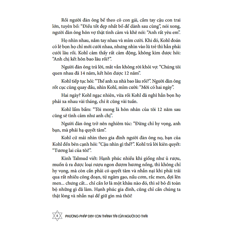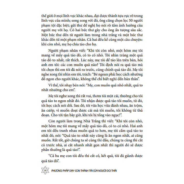Phương Pháp Dạy Con Thành Tài Của Người Do Thái không chỉ đơn thuần là một quyển sách về giáo dục. Nó mở ra một thế giới quan về cách mà người Do Thái đã thành công trong việc phát triển tri thức và kỹ năng cho thế hệ tương lai. Tác giả tập trung vào những nguyên tắc cơ bản mà người Do Thái áp dụng trong việc nuôi dạy con cái, từ việc chú trọng đến sự độc lập, khuyến khích tư duy phản biện cho đến việc truyền cảm hứng về giá trị của tri thức và sự kiên trì. Cuốn sách đọng lại những bài học quý giá, có thể giúp bất kỳ bậc phụ huynh nào tìm ra con đường đúng đắn trong việc giáo dục con cái.