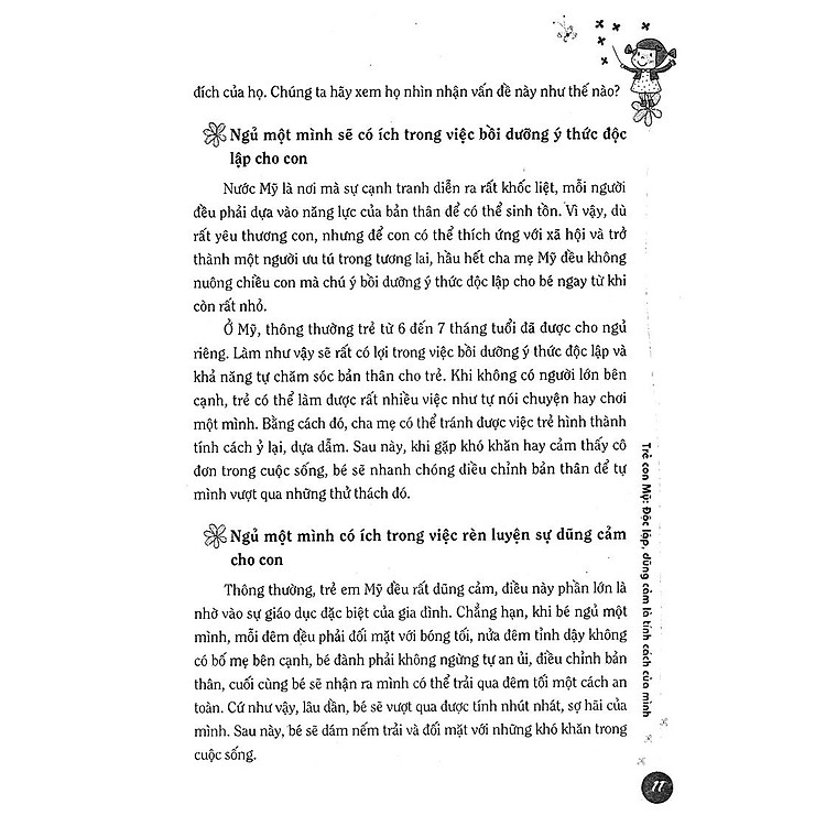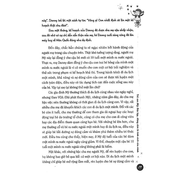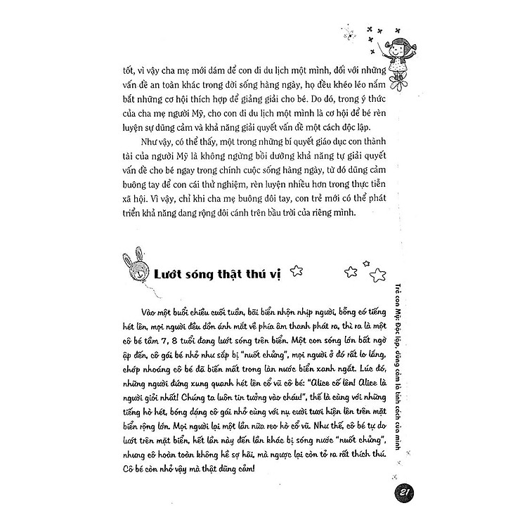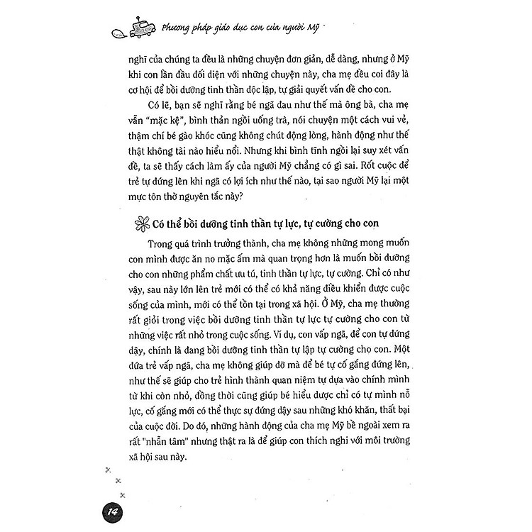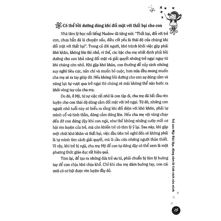 Tác giả đưa ra những mẫu chuyện ngắn rất hay và sau những mẫu chuyện đó là các cách giải quyết vấn đề của các bậc phụ huynh Mĩ. Ta có thể dễ dàng nhận thấy sự khác biệt giữa cách xử lý vấn đề của mình và của họ rồi từ đó chiêm nghiệm, đúc kết cho chính mình cách xử lý tình huống giúp con phát triển 1 cách tốt nhất.