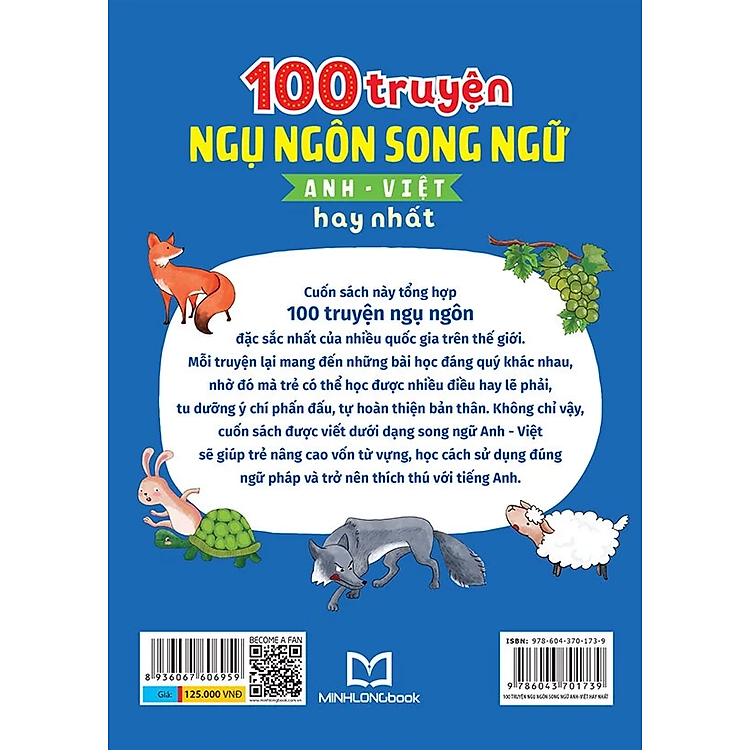 100 Truyện Ngụ Ngôn Song Ngữ Anh – Việt Hay Nhất là một tập hợp những câu chuyện ngụ ngôn nổi tiếng từ nhiều nền văn hóa khác nhau. Mỗi truyện không chỉ đơn thuần là một câu chuyện, mà còn là một bài học sống động, phản ánh những giá trị đạo đức, nhân văn. Những câu chuyện này được viết bằng cả tiếng Anh và tiếng Việt, tạo cơ hội cho người đọc không chỉ thưởng thức mà còn nâng cao khả năng ngôn ngữ. Bạn sẽ tìm thấy trong sách những gương mặt quen thuộc như chú rùa và thỏ, hay những hình ảnh sống động về cuộc sống tự nhiên, tất cả đều mang đến cho bạn những thông điệp ý nghĩa.