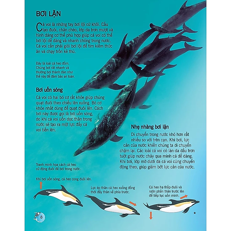 - Kiến thức phong phú: Cuốn sách mang đến một lượng thông tin đa dạng về các loài cá voi và cá heo, từ kích thước, thức ăn đến hành vi giao tiếp của chúng.