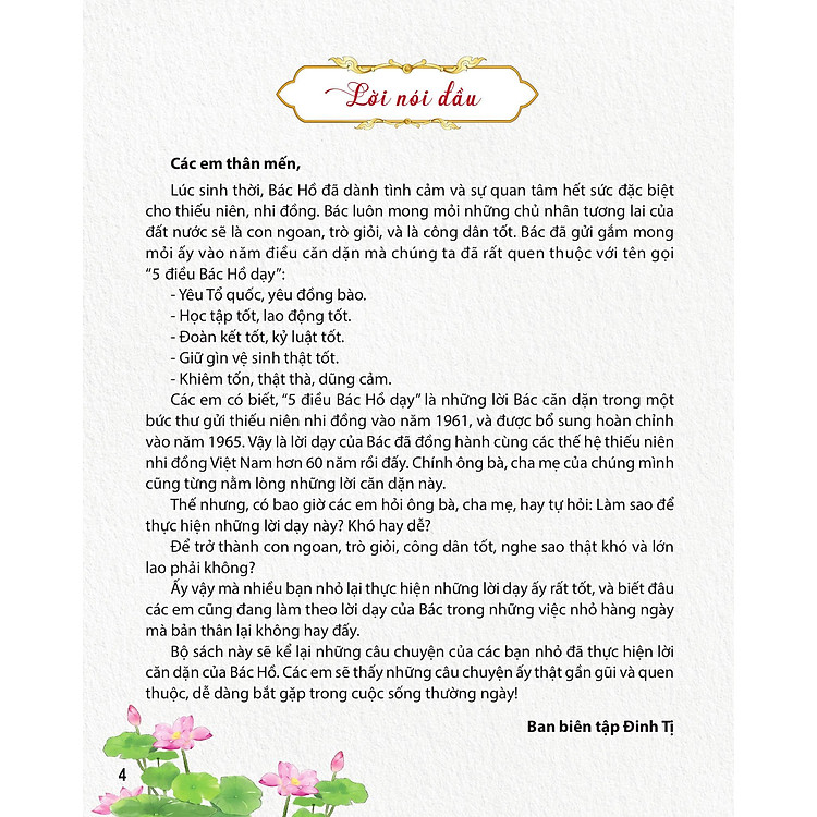 “Bài Học Hay Từ 5 Điều Bác Dạy” không chỉ đơn thuần là một tác phẩm văn học mà còn là một nguồn tài liệu quý giá cho sự phát triển bản thân. Cuốn sách này tóm lược những bài học sâu sắc từ Bác Hồ, cụ thể là 5 điều mà Bác đã dạy, như: học tập tốt, lao động tốt, và nhiều giá trị khác nữa. Những bài học này không chỉ dành cho thế hệ trẻ mà còn có giá trị cho tất cả mọi người trong việc phát triển bản thân và xây dựng cộng đồng.