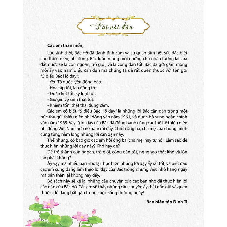 Cuốn sách “Bài Học Hay Từ 5 Điều Bác Dạy – Yêu Tổ Quốc, Yêu Đồng Bào” không chỉ đơn giản là một tác phẩm văn học, mà là một nguồn cảm hứng cho những ai đang tìm kiếm ý nghĩa cuộc sống. Như Bác Hồ đã từng nói: “Yêu nước là một tình cảm thiêng liêng.” Hãy để những bài học từ cuốn sách này chạm đến trái tim bạn, giúp bạn sống trọn vẹn hơn với tổ quốc và đồng bào.