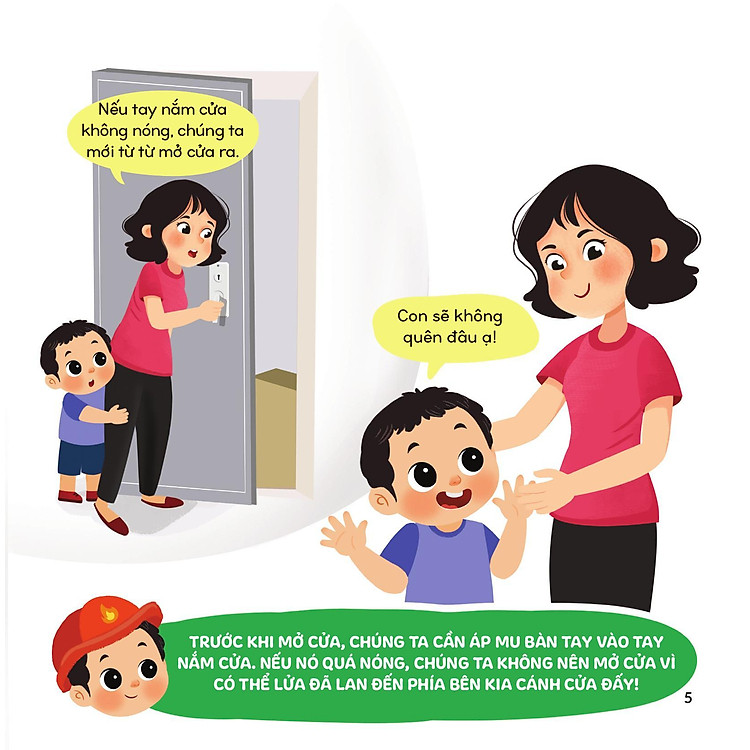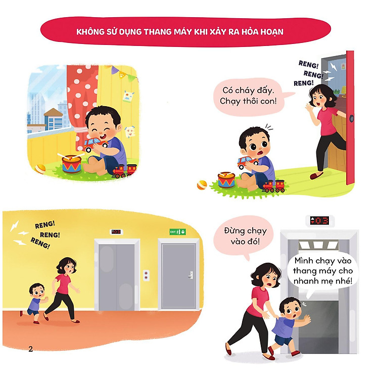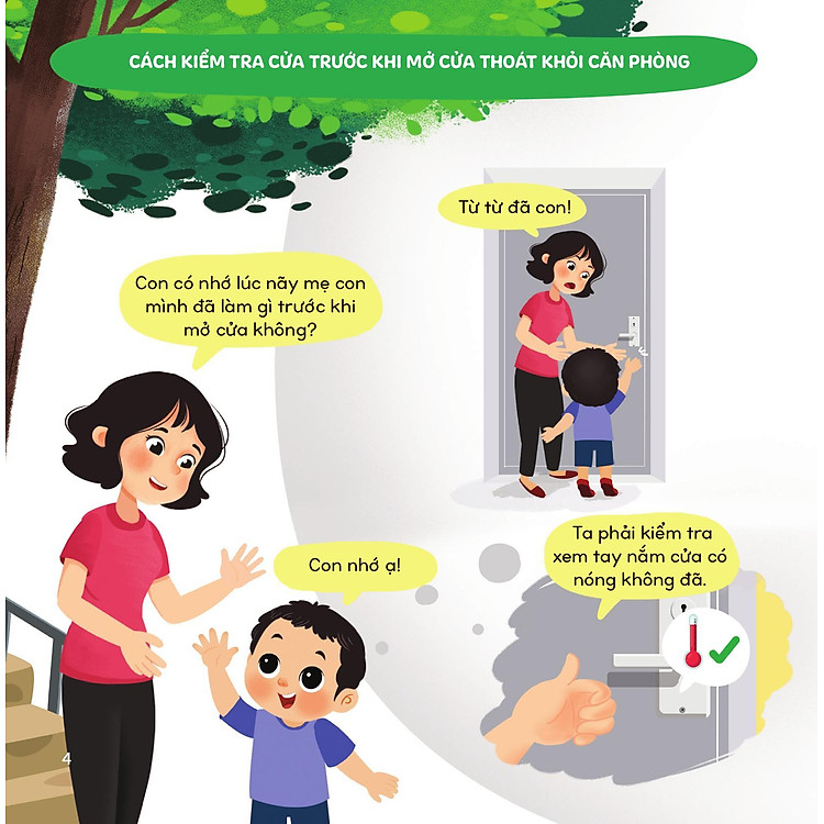 - Cách xử lý tình huống khẩn cấp: Công thức “3 điểm” (báo động, thoát nạn, gọi cứu hộ) được trình bày rõ ràng, giúp trẻ biết phải làm gì khi gặp nguy hiểm.