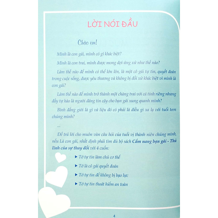 Bạn có bao giờ tự hỏi, trong cuộc sống này, chúng ta phải làm gì để trở thành phiên bản tốt nhất của chính mình? Đặc biệt là khi bạn là một cô gái, bạn có thể cảm thấy áp lực từ nhiều phía – từ gia đình, bạn bè cho đến xã hội. Cuốn sách Cẩm Nang Bạn Gái – Thủ Lĩnh Của Sự Thay Đổi sẽ giúp bạn khám phá những điều thú vị và đầy ý nghĩa về bản thân mình, khuyến khích bạn sống tự tin và quyết đoán hơn. Cuốn sách này sẽ giúp bạn chinh phục những thách thức trong cuộc sống hàng ngày.