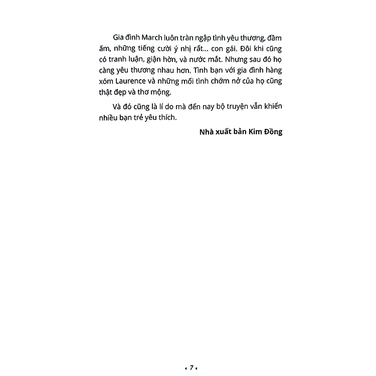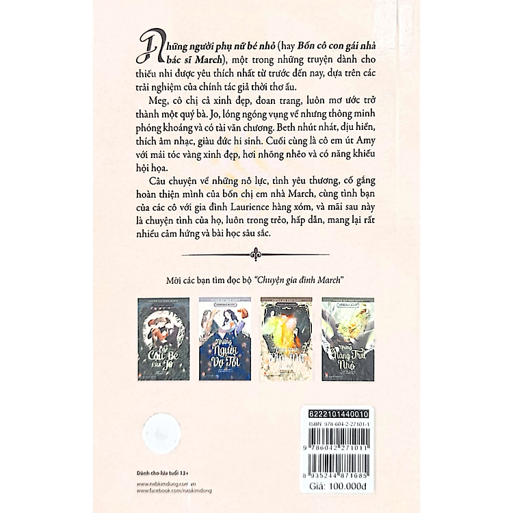 Chuyện Gia Đình March: Những Người Phụ Nữ Bé Nhỏ là tác phẩm nổi tiếng của Louisa May Alcott, kể về cuộc sống của bốn chị em nhà March: Meg, Jo, Beth và Amy. Mỗi nhân vật mang một cá tính riêng biệt, từ Meg dịu dàng và trách nhiệm cho đến Jo mạnh mẽ và tự lập. Cuốn sách không chỉ tập trung vào những câu chuyện hàng ngày mà còn khám phá những ước mơ, khát vọng, và cả những thử thách mà mỗi người phải đối mặt trong bối cảnh xã hội của thế kỷ 19. Qua từng trang sách, bạn sẽ cảm nhận được sự gắn kết và những bài học quý giá về tình yêu thương, lòng kiên nhẫn và sự trưởng thành.