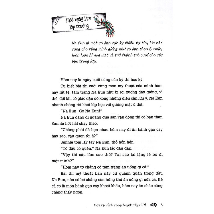 “Hóa Ra Mình Cũng Tuyệt Đấy Chứ” là câu chuyện về Na Eun, một cô bé nhút nhát đang trên con đường tìm kiếm bản thân mình. Qua từng trang sách, bạn sẽ theo chân Na Eun khám phá những nỗi lo, những giấc mơ và cả những nỗi sợ hãi mà bất cứ ai cũng có thể gặp phải. Cuốn sách không chỉ đơn thuần là một câu chuyện giải trí, mà còn chứa đựng những bài học quý giá về lòng tự trọng, sự dũng cảm và sức mạnh của tình bạn. Bạn sẽ cảm nhận được rằng, thật ra mình cũng có thể tuyệt vời theo cách riêng của mình.