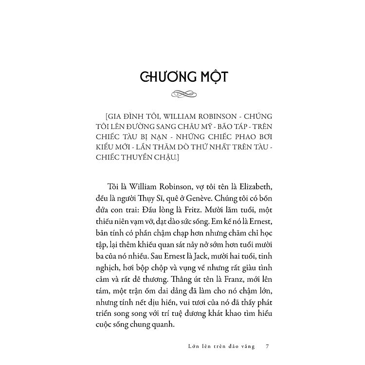 Lớn Lên Trên Đảo Vắng là câu chuyện về ông William cùng vợ và bốn cậu con trai, những người đã trải qua một tai nạn kinh hoàng khi đang trên đường tới châu Mỹ để tìm kiếm cơ hội mới. Khi chiếc tàu của họ bị đắm, họ buộc phải dạt vào một hòn đảo hoang vắng. Tại đây, cuộc sống của họ biến thành một cuộc phiêu lưu đầy gian nan nhưng cũng không kém phần thú vị. Họ học cách sống như những người nguyên thủy, từ việc tìm kiếm thức ăn, xây dựng nơi ở cho đến việc giáo dục con cái trong một môi trường hoàn toàn khác biệt. Cuốn sách này không chỉ là một câu chuyện về sinh tồn mà còn khám phá sâu sắc vào tâm lý và mối quan hệ giữa các thành viên trong gia đình.