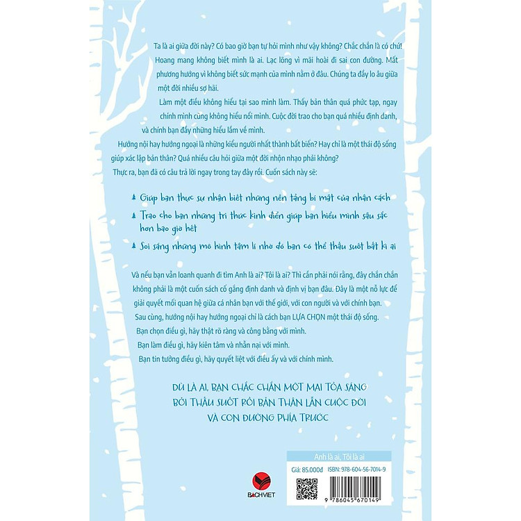 Không chỉ cung cấp kiến thức, “Anh là ai, tôi là ai” còn truyền cảm hứng mạnh mẽ cho độc giả. Đây là lựa chọn tuyệt vời cho những ai muốn tìm nguồn động lực mới. Hãy tham khảo ngay bảng giá bên dưới để mua sách dễ dàng và tiết kiệm hơn.”