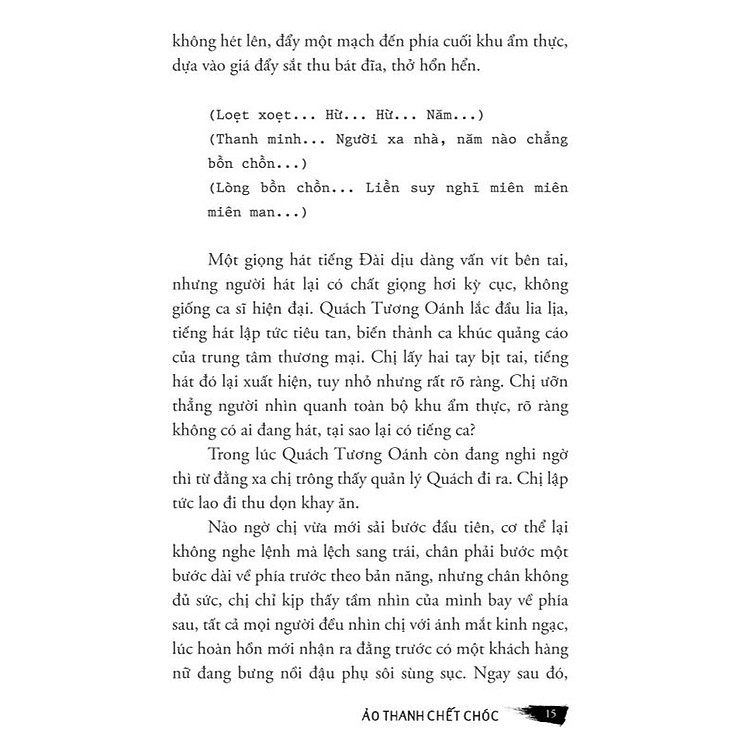 Bỗng một ngày, Quách Tương Oánh tình cờ phát hiện ra rằng cuộc sống của mình đang bị đe dọa bởi những sự kiện kỳ lạ, bí ẩn. Những âm thanh lạ và những hình ảnh ma quái xuất hiện trong cuộc sống hàng ngày của cô, tạo nên một bầu không khí căng thẳng và hồi hộp. “Ảo Thanh Chết Chóc” không chỉ là một cuốn tiểu thuyết trinh thám thông thường, mà còn là một tác phẩm sâu sắc khắc họa tâm lý nhân vật, những sự ám ảnh và nỗi sợ hãi mà con người phải đối mặt.